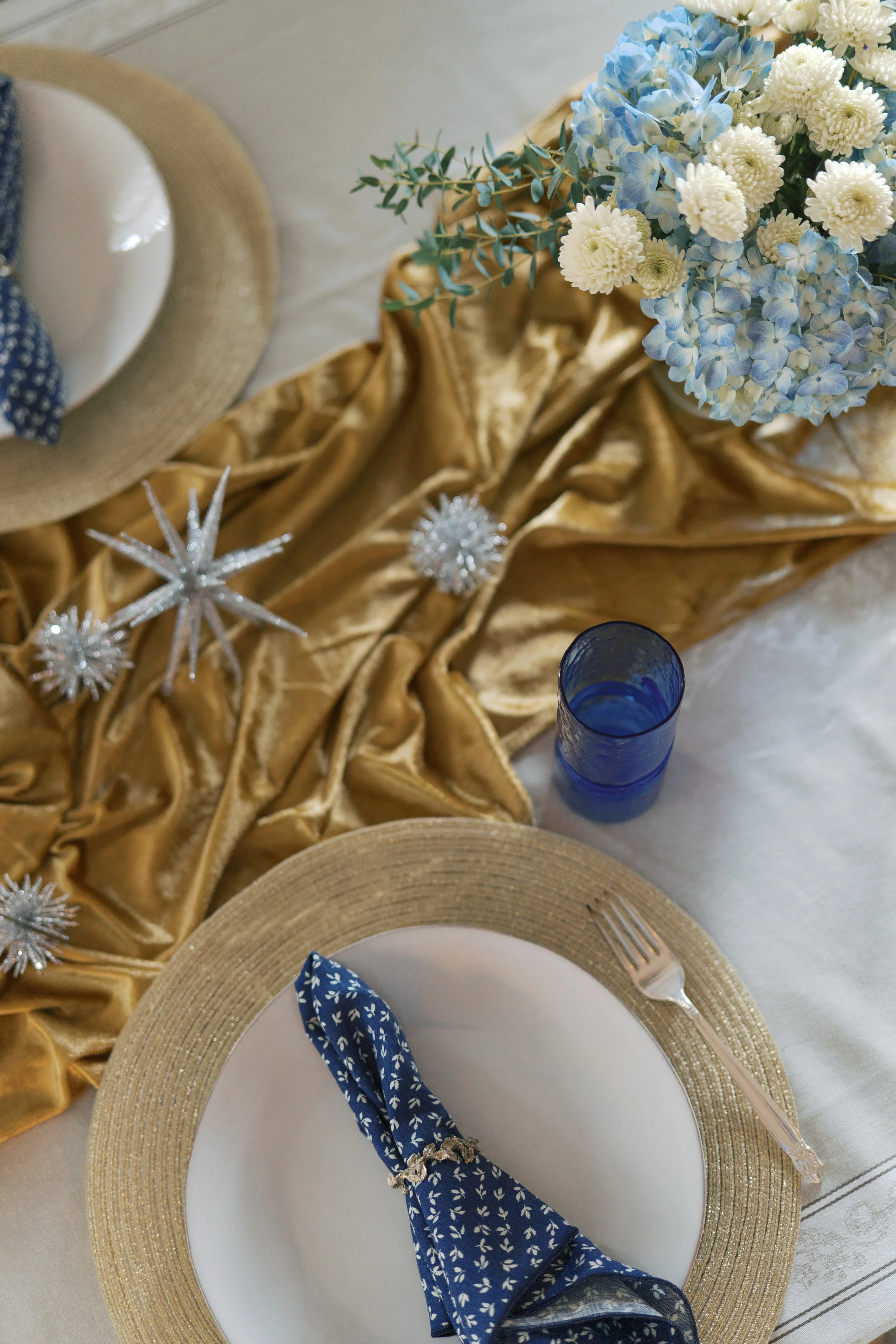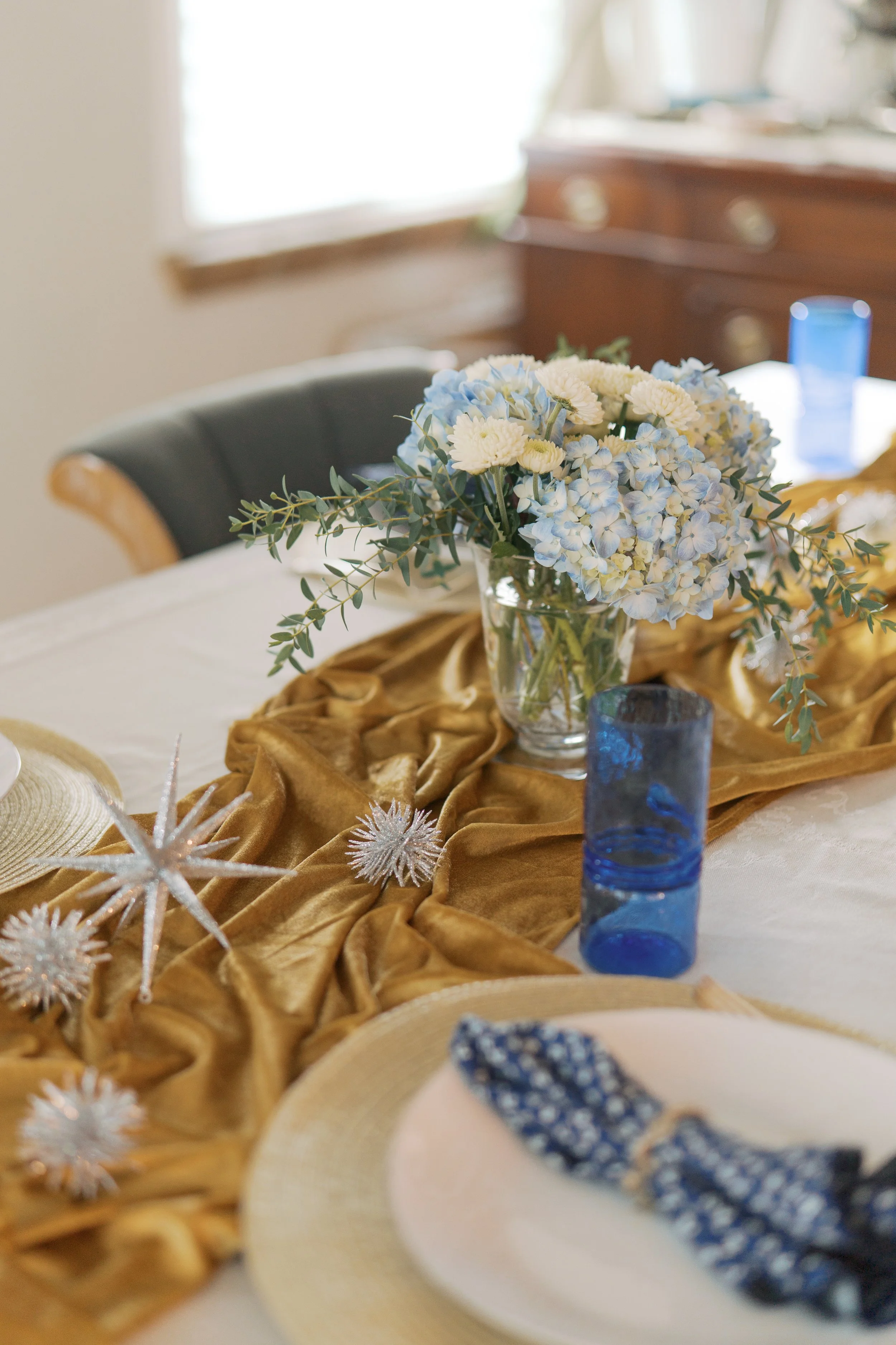 I love the way this Hanukkah tablescape came together. Classic Hanukkah colors—blue, silver, gold, white—were easy to find in what I already had at home. The spikey silver ornaments in large and small strewn across a simple piece of gold velvet runner add such interest to the table without any effort. They’d work fabulously for a New Year’s party as well. I actually had the runner from a Rosh Hashanah honey tasting a few years back and it continues to feel like a staple. I always wish I could link these gorgeous glasses, but they’re hand blown by a local artist and my mom bought them years and years ago and then recently gifted them to me. They’re beautiful and I’ve been looking for something shareable ever since, but have been coming up short. It feels like something you might have to search for at estate and antique sales or art fairs.